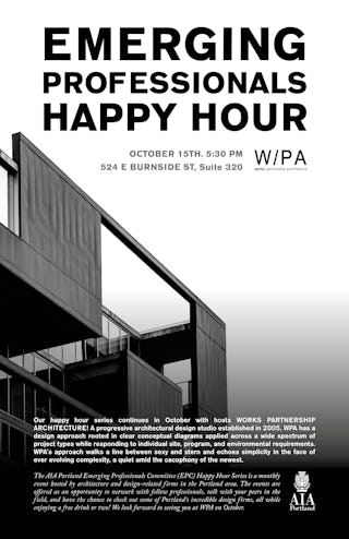 The AIA Portland Emerging Professionals Committee (EPC) Happy Hour Series is a monthly event hosted by architecture and design-related firms in the Portland area. The events are offered as an opportunity to network with fellow professionals, talk with your peers in the field, and have the chance to check out some of Portland‘s incredible design firms, all while enjoying a free drink or two! We look forward to seeing you at W.PA on October.”
