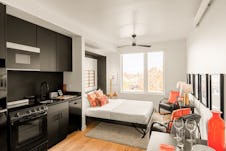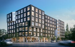 The neighborhood offers a residential context with pedestrian access to Portland Community College, the Adidas Corporate Campus, and the Mississippi business district. Nomad offers motorcycle parking, electric vehicle charging, a fitness center, workspace, a roof deck, and a community room.